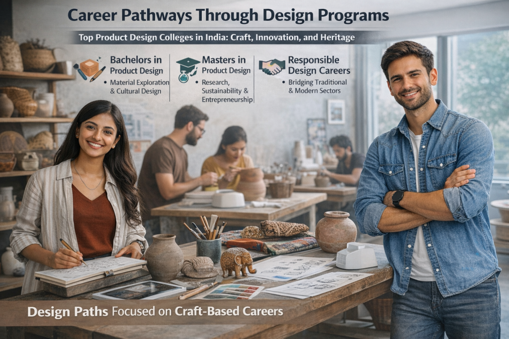 Students interested in craft-led careers often choose top product design colleges in India, where innovation and heritage coexist. Undergraduate programs like bachelors in product design introduce learners to material exploration and cultural design, while advanced programs such as masters in product design focus on research, sustainability, and entrepreneurship. These pathways equip designers to work responsibly within traditional sectors.